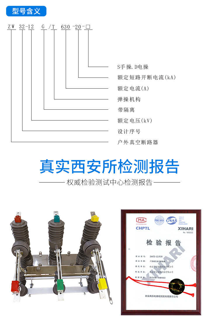ZW32-12系列户外交流高压真空断路器(以下简称“断路器”)系三相交流50Hz户外高压开关设备,主要用于农网和城网的10kV户外配电系统,作为分、合负荷电流、过载电流及短路电流之用;也可用于其它类似场所。ZW32-12系列户外交流高压真空断路器符合国家GB 1984《交流高压断路器》和国际电工委员会IEC 60056《高压交流断路器》等标准。